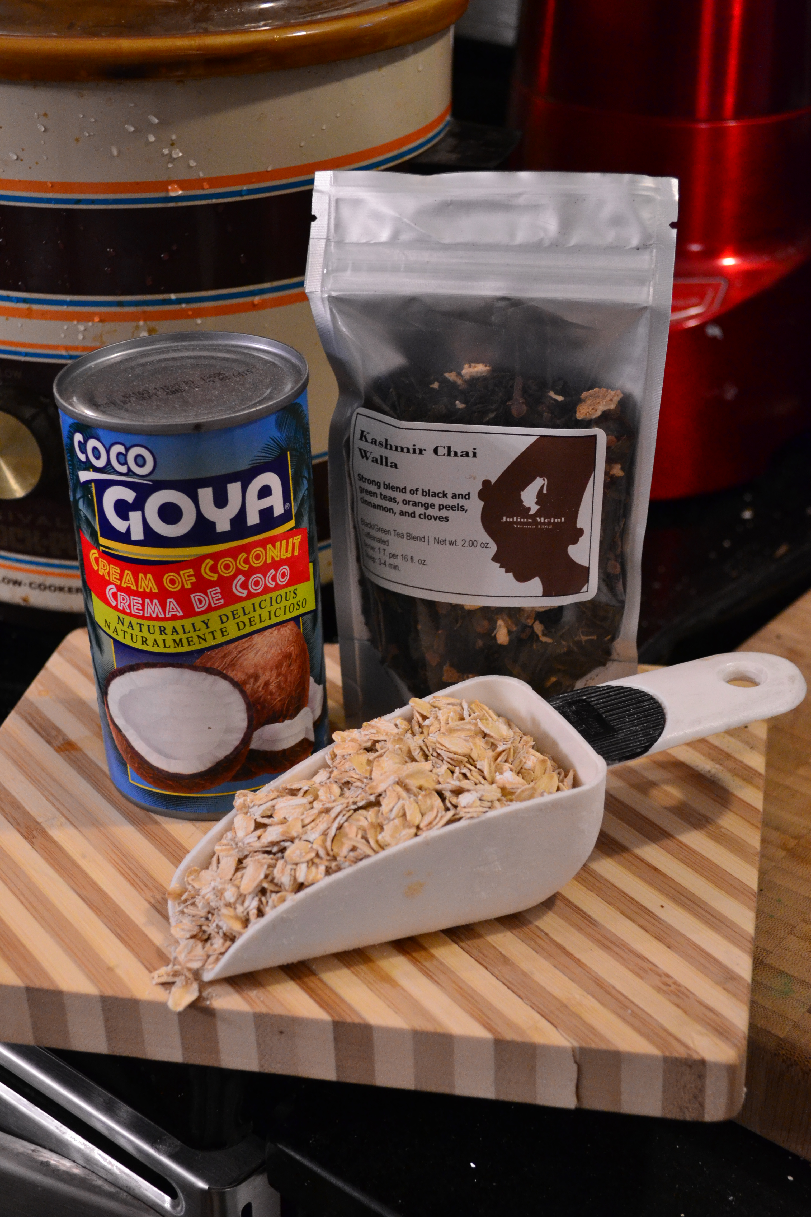 Coconut Chai Oatmeal Ingredients Posted by kitchentourist on October 22, 2012 I might try using just spices and coconut milk with sugar in the future, but this was really easy and came out great. Share this: Click to print (Opens in new window) Print Click to email a link to a friend (Opens in new window) Email TweetShare on TumblrLike Loading...